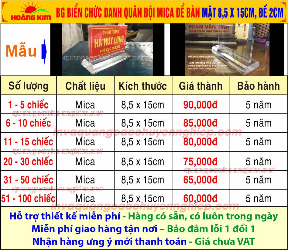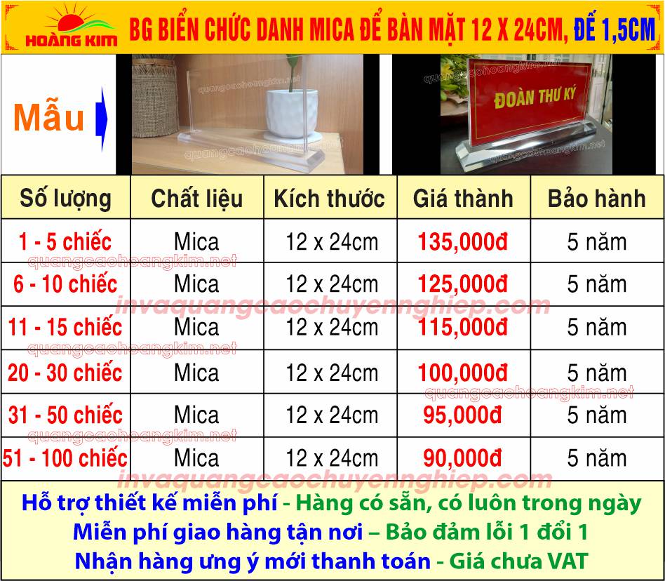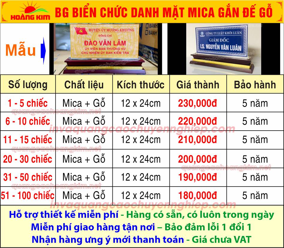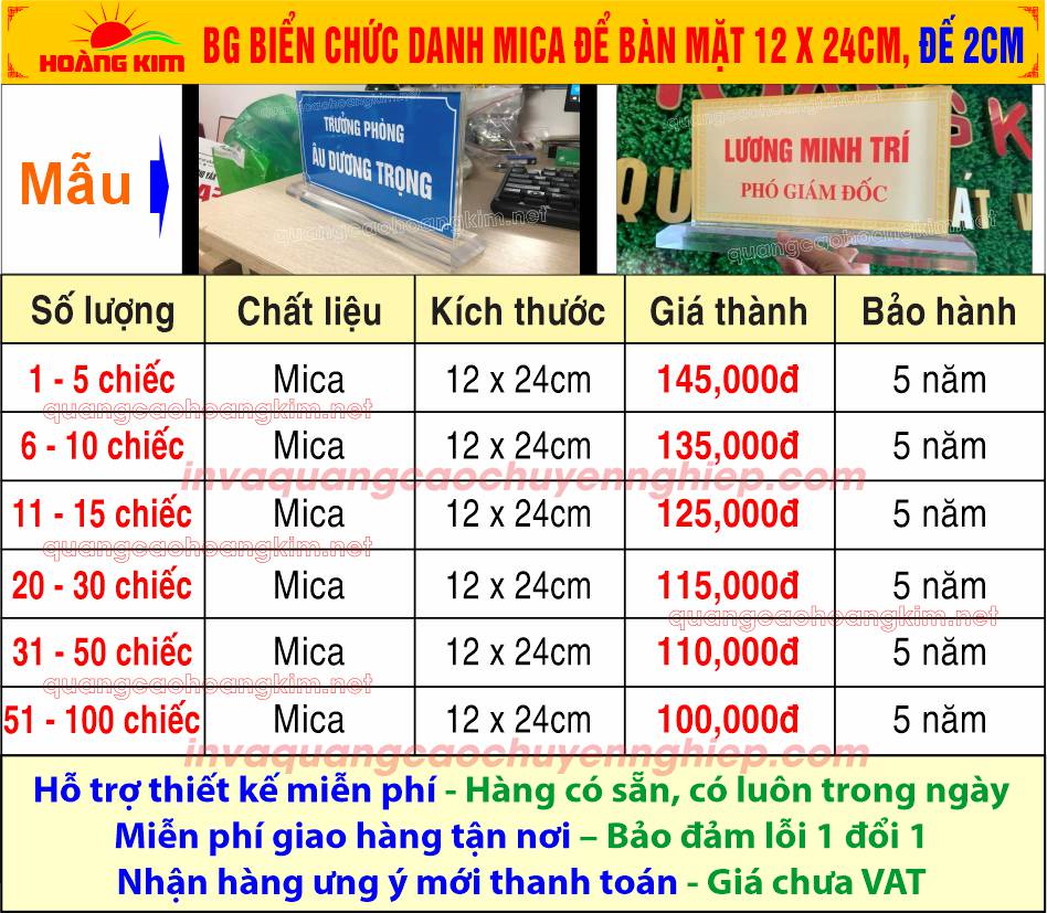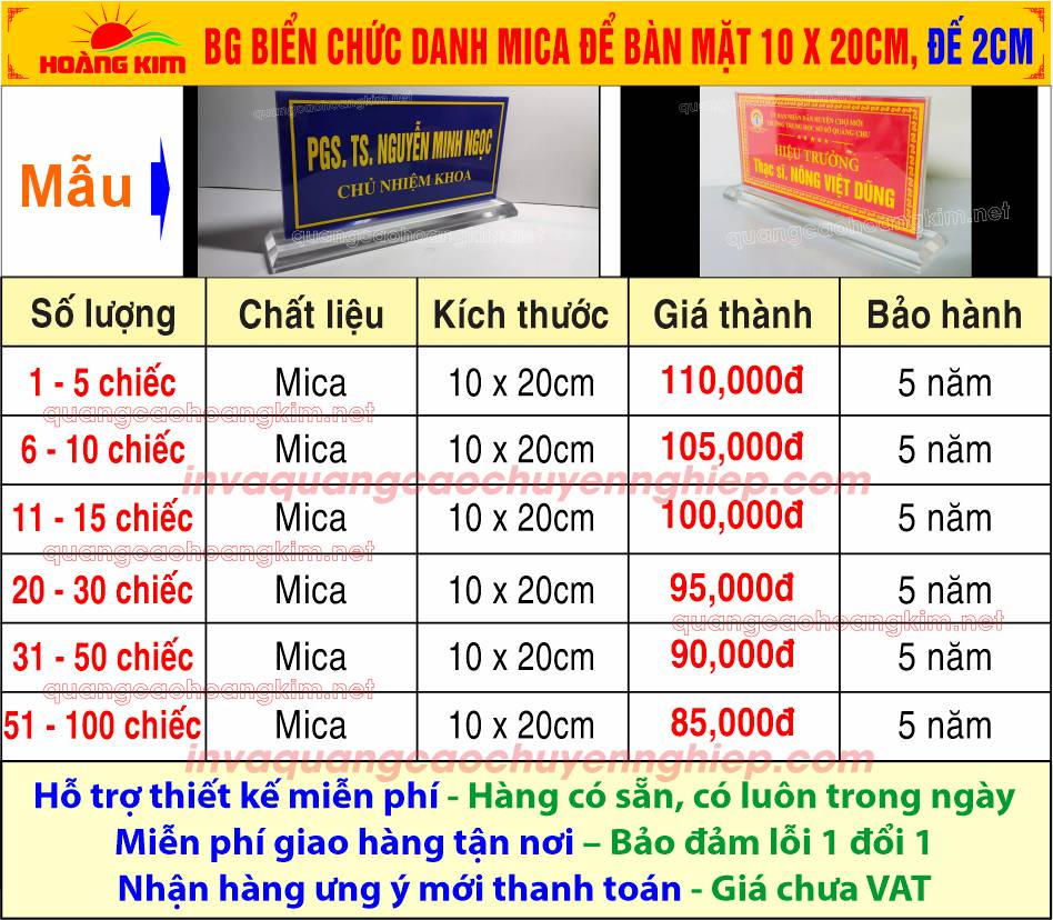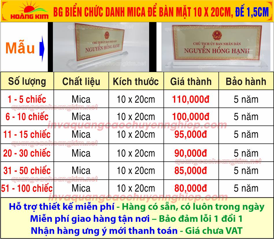 BẢNG TÊN MICA ĐỂ BÀN, KỆ MICA CHỨC VỤ GIẢM 30%. Công ty Quảng cáo Hoàng Kim chuyên nhận thiết kế bảng tên mica để bàn, kệ chức vụ trên toàn quốc, in bảng chức danh mica để bàn 2 mặt, báo giá làm bảng tên để bàn bằng gỗ, các mẫu biển chức danh mica để bàn tại tp Hà Nội, giá bảng chức danh mica để bàn, biển tên cài áo, thẻ tên nhân viên, biển công ty bằng mica, inox ăn mòn... làm bằng chất liệu tốt nhất, giao hàng tận nơi.