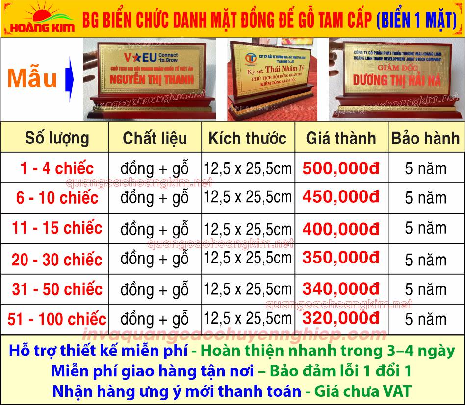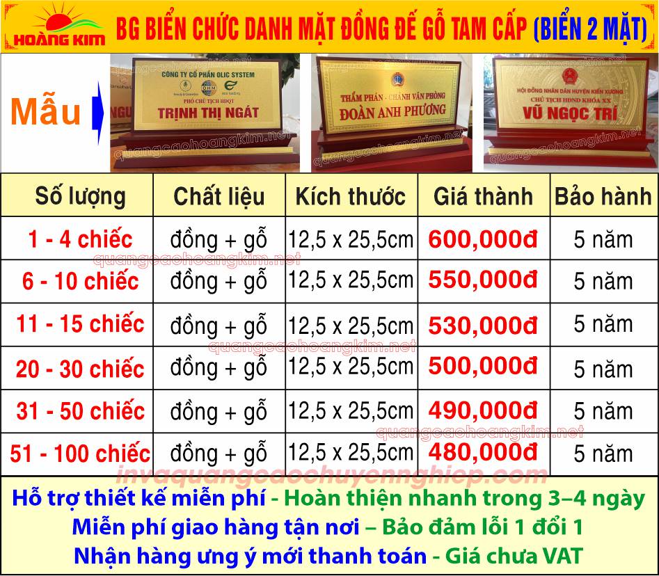 Biển chức danh đồng 2 mặt có phần đế làm bằng gỗ, viền bao quanh bằng miếng thẻ đồng ăn mòn. Mặt bằng gỗ và được ép 2 miếng đồng ăn mòn trước và sau.