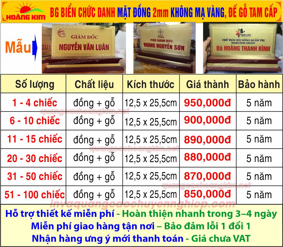 Biển chức danh đế gỗ , sử dụng mạt đồng 2mm là dòng biển chức danh sang trọng và đẳng cấp số 1 Việt Nam . Nói đến biển đồng 2mm là nhắc đến dòng biển chức danh dành cho các cấp lãnh đạo cao cấp thường là giám đốc, tổng giám đốc , chủ tịch hội đồng quản trị , Đại tá, Cục Trưởng , Thủ tướng,…