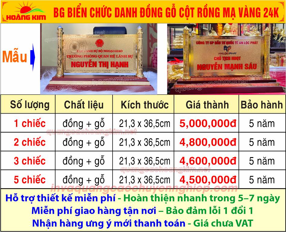 Hàng độc quyền được sản xuất duy nhất tại Công ty Hoàng Kim. Biển chức danh 2 cột trạm khắc hoa văn rồng, được mạ vàng 24K cho sản phẩm sang trọng đẳng cấp